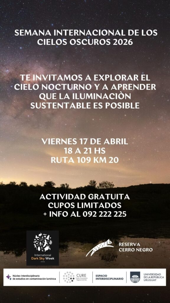 En el marco de la Semana Internacional de los Cielos Oscuros 2026, desde el Núcleo Interdisciplinario de Estudios en Contaminación Lumínica les invitamos a una actividad abierta en Ambá (Reserva Cerro Negro) para aprender de nuestro cielo y disfrutar de la oscuridad en un entorno ideal. Haremos observación con telescopios y a simple vista, compartiremos imágenes y contenidos sobre astronomía y contaminación lumínica. Les esperamos!